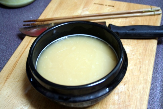 물 반절 못되게 채우고 청국장 두숟가락 넣고 저어 줍니다..